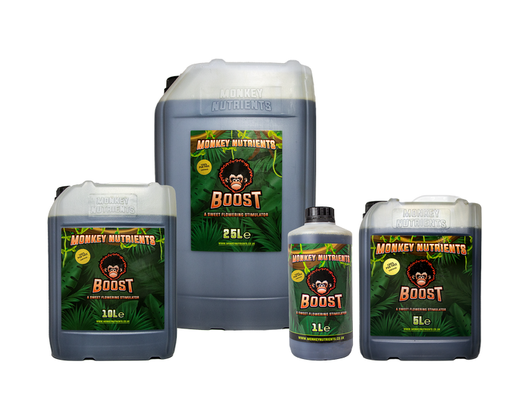 Monkey Boost is a metabolism enhancer that massively increases your plants genetic potential, with sweeter results. A combination of natural growth stimulants , amino acids and carbohydrates. Boost will allow your plants to meet the high energy demands of fruit and flower production, with its formula for increasing photosynthesis and sugar content. This will maximise the yields and quality of your labour providing richer heavier harvests. Made from all natural ingredients, Monkey Boost will enhance flavour and weight , whilst keeping plant micro-life happy at the same time. Give your plants the boost they deserve, when they need it